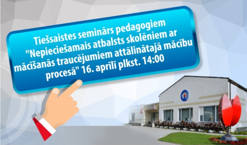 3.Zemgales reģiona kompetenču attīstības centrs (ZRKAC) 16. aprīlī plkst.14.00, piedāvā tiešsaistes semināru pedagogiem “Nepieciešamais atbalsts skolēniem ar mācīšanās traucējumiem attālinātajā mācību procesā”.